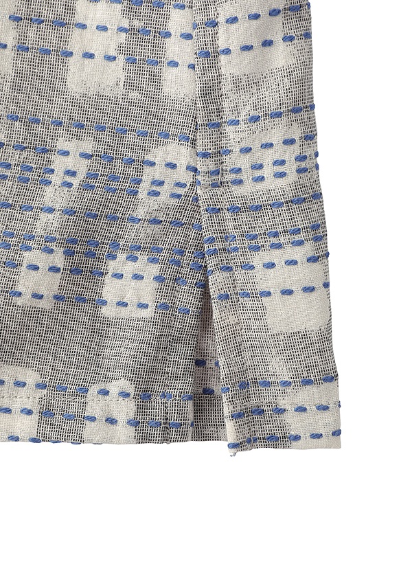 一部にマンガンという鉱物で染めた糸を使用し、その上から酸化・還元の溶剤でプリントを施すことで、柄の部分に黒と白のコントラストを生み出した、昔ながらの染色技術を用いた素材です。先染めで表現したサシコステッチと、手描き風のライン柄が複雑に重なり合い、伝統的な技法にモダンな感性を加えた独特の仕上がりになっています。