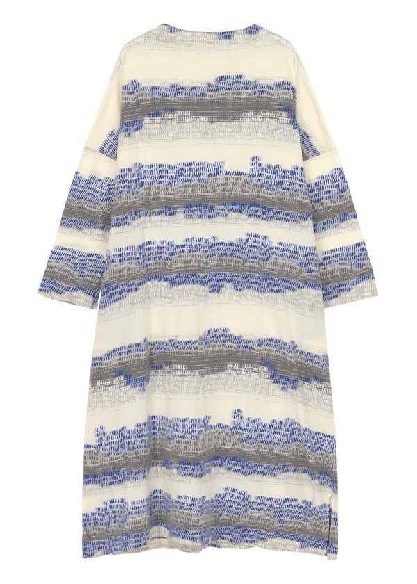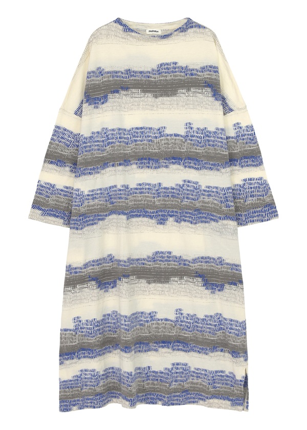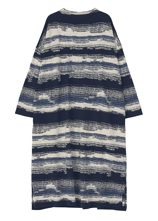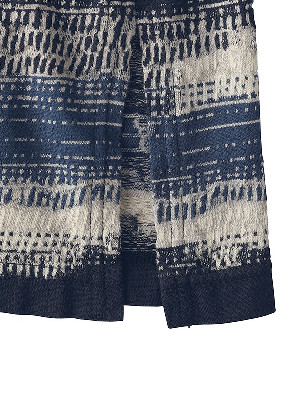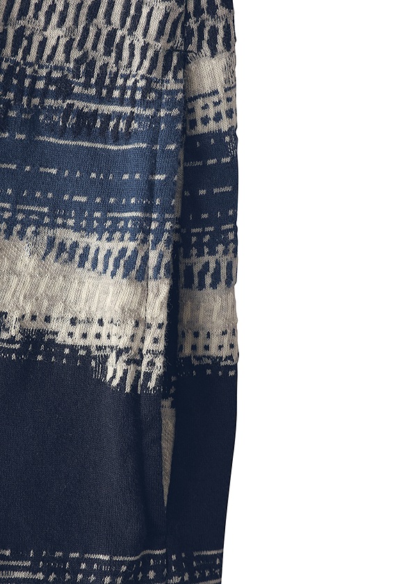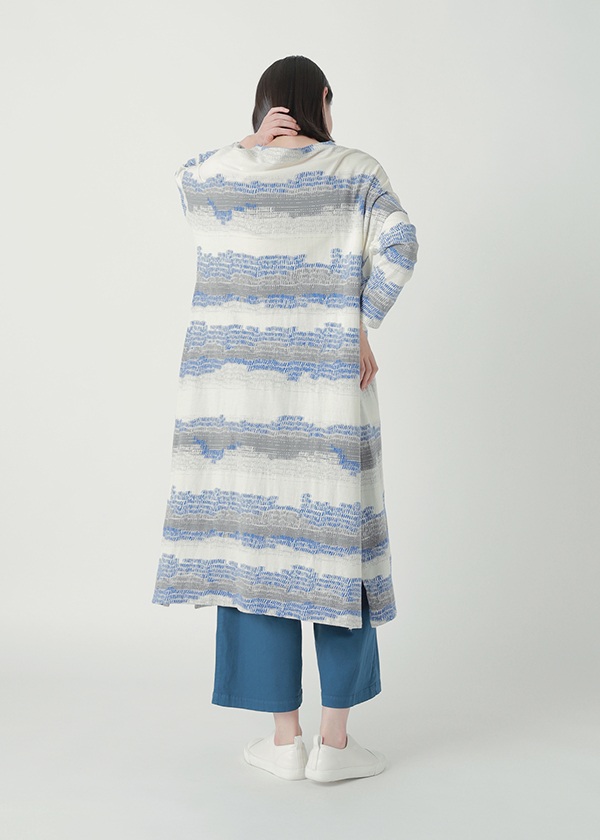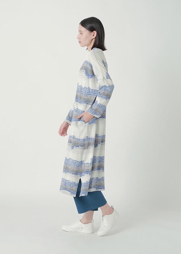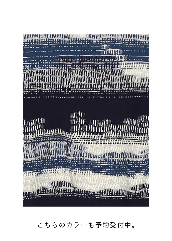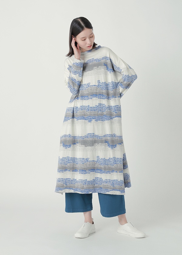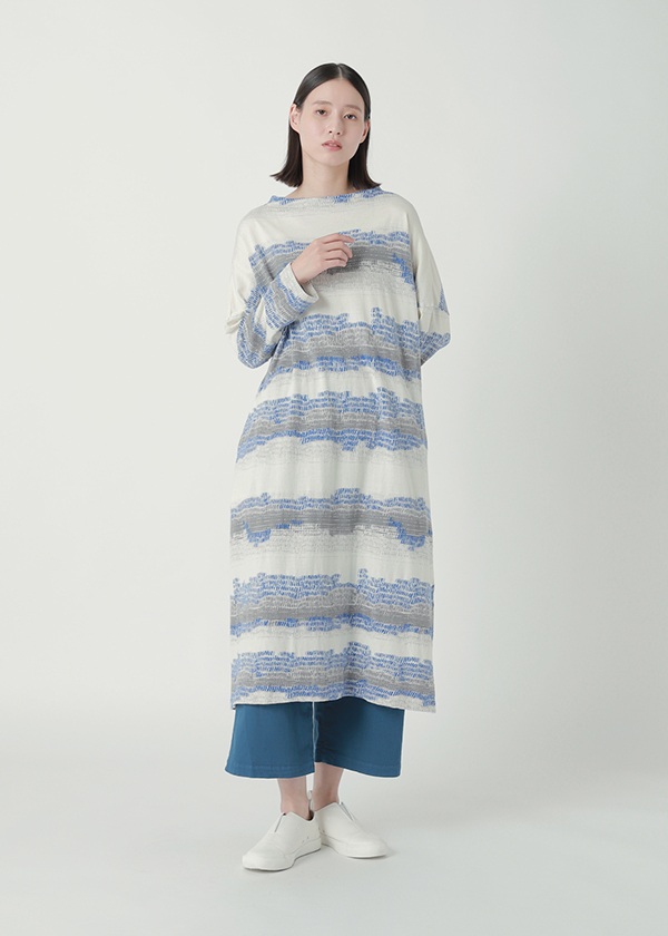ハンドステッチの刺し子のような複雑な柄を表現した変形ボーダー素材です。番手の異なる糸と組織の違いによって、凹凸のある豊かな表情を生み出しています。カラーによっても印象が異なり、まるで一日の中で移ろう海辺の空のように、繊細に表情を変える素材です。