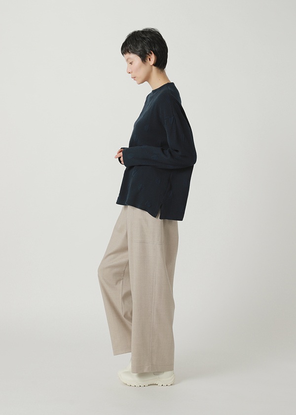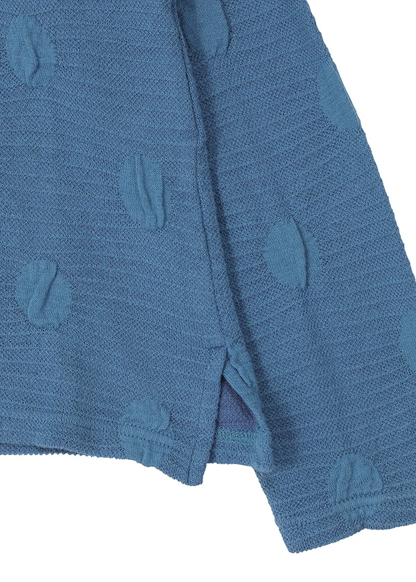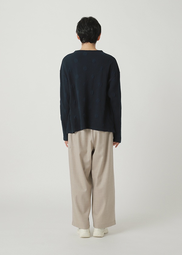 柔らかな風合いを残しながら、編み目を詰めて小さめのドット柄に仕上げました。ゆっくりと丁寧に編み下げることで、自然なふくらみとソフトなタッチが生まれています。両面天竺を柄でつなげた風通ジャカードで、裏側には部分的にストレッチ糸を組み合わせることで、立体感のあるドット柄を表現。さらに糸の太さを変えることで、軽やかな着心地も実現しました。