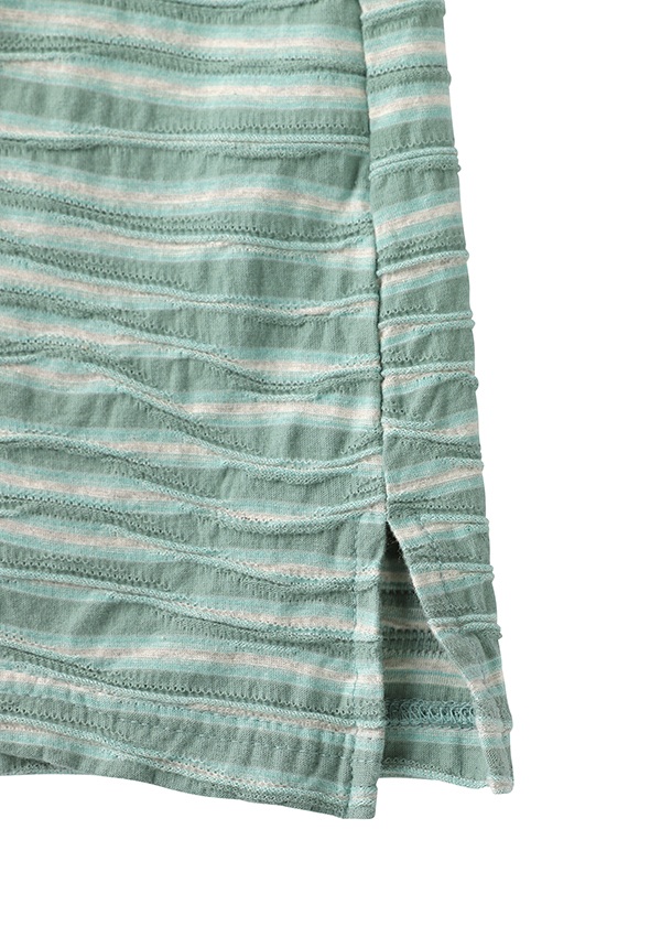 ボーダー柄の一部に糸の引き揃えでにじみを表現したカスリ調を施し、さらにタック組織でランダムなウェーブ柄の凹凸を出した立体感のある素材です。全体にポリウレタンを含むため、優れたストレッチ性を実現。タンブラー加工により、風合いはソフトで快適な仕上がりです。