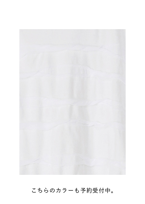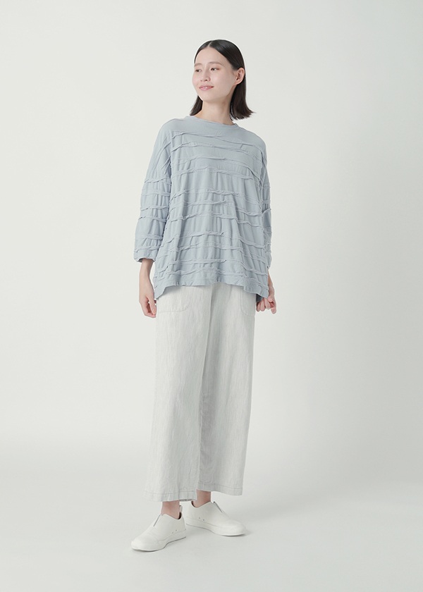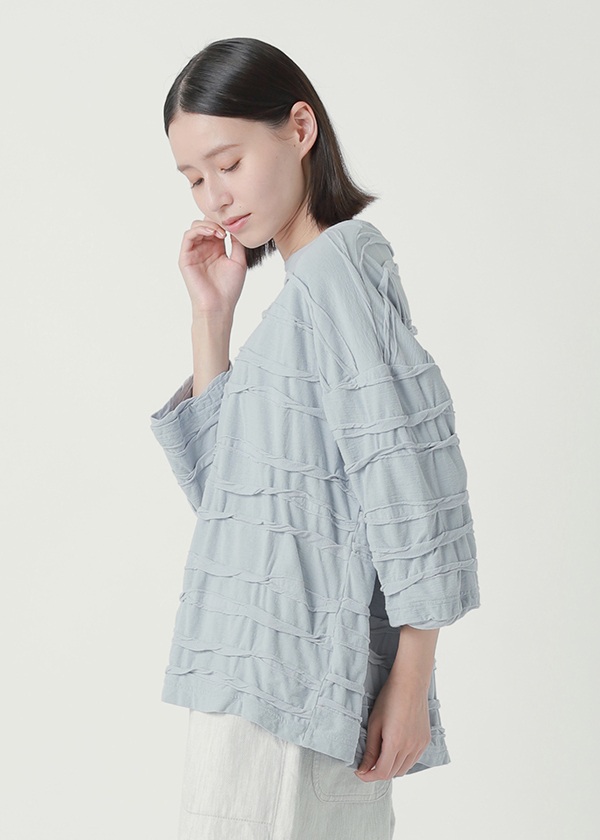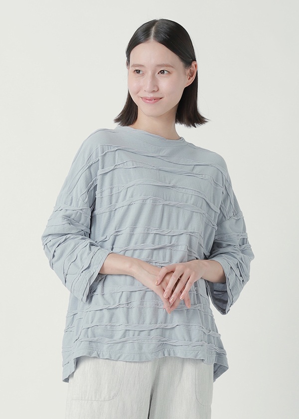 ジャカード技術により、ランダムでピンタックのようなさざ波状の凹凸を編み立てた、見た目にも触感にも楽しい生地です。ほどよいハリとシャリ感があり、肌離れが良く快適な着心地に仕上がっています。