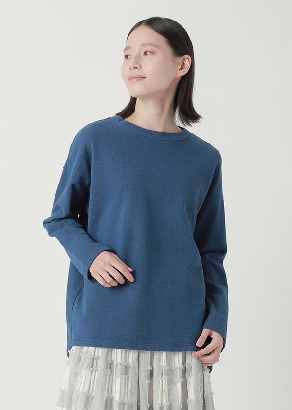 2023S/Sからご好評いただいている定番素材です。インレイの変形編みによって、ブロックを積み上げたような立体的な凹凸感を表現しています。コットン100%で、ユニセックスな印象のあるカジュアルな度詰め素材ながら、凹凸のある編み組織が空気を含むことで、軽さとふくらみのある風合いに仕上がっています。