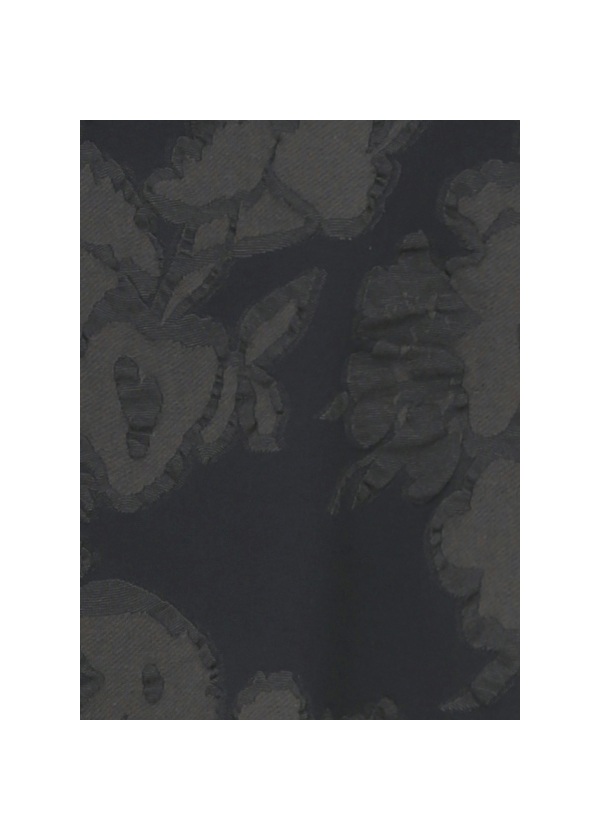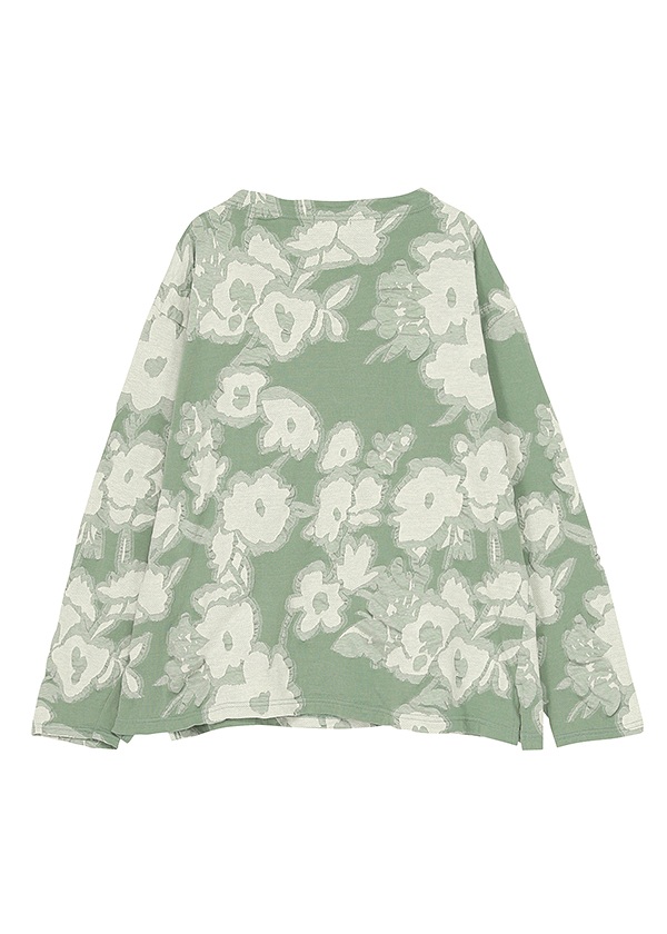 ベースと柄で異なる糸を使用しインターシャ編み機を使って花柄を表現しています。柄の縁部分の組織を変えることで立体感のある表情を出しています。綿100%ならではの柔らかさを感じられる、華やかさのある一着です。