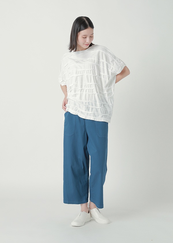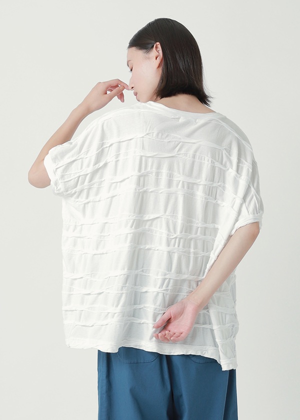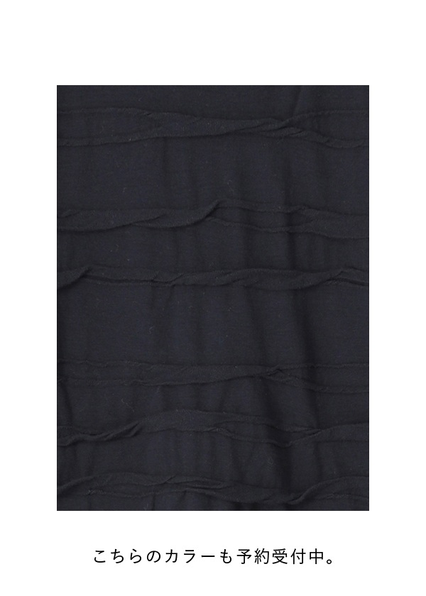 ジャカード技術により、ランダムでピンタックのようなさざ波状の凹凸を編み立てた、見た目にも触感にも楽しい生地です。ほどよいハリとシャリ感があり、肌離れが良く快適な着心地に仕上がっています。