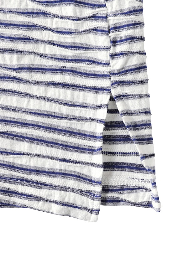 ボーダー柄の一部に糸の引き揃えでにじみを表現したカスリ調を施し、さらにタック組織でランダムなウェーブ柄の凹凸を出した立体感のある素材です。全体にポリウレタンを含むため、優れたストレッチ性を実現。タンブラー加工により、風合いはソフトで快適な仕上がりです。