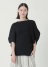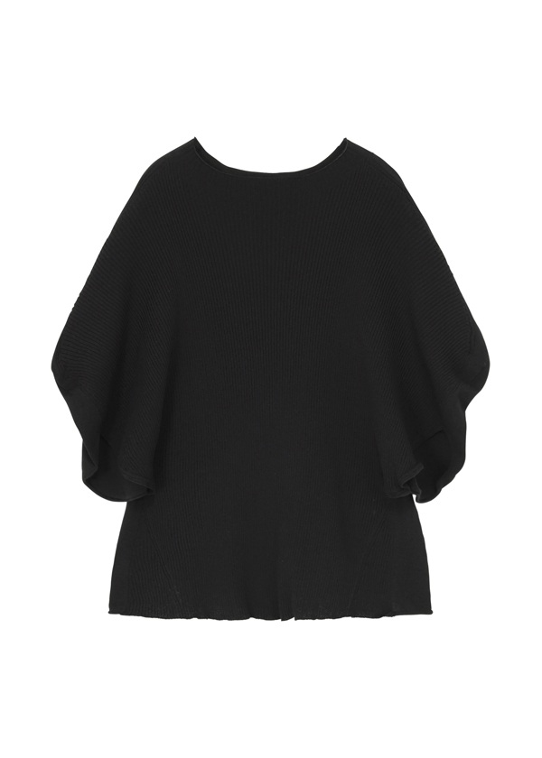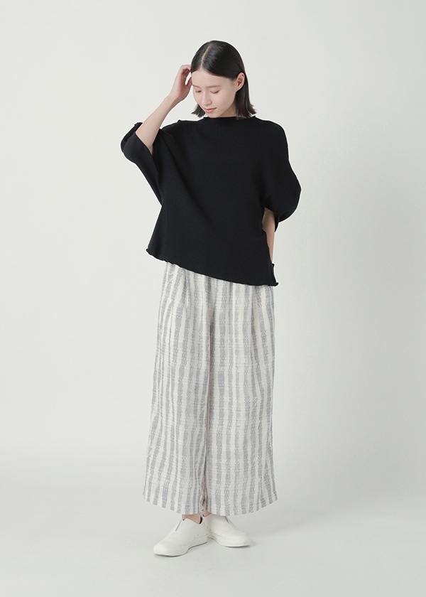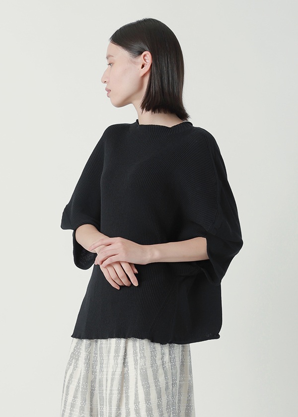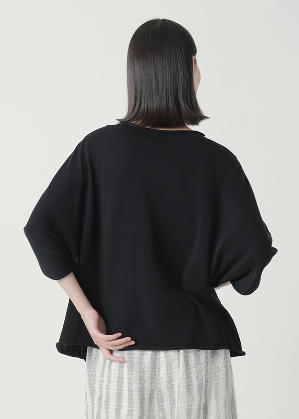 綿にストレッチ性のあるポリエステルを撚糸し、適度な伸縮性とハリ感を実現しました。シワになりにくく、着用時に立体感のあるシルエットが特徴です。ホールガーメントで前身頃と後身頃の編み組織を変え、表情にメリハリをつけています。