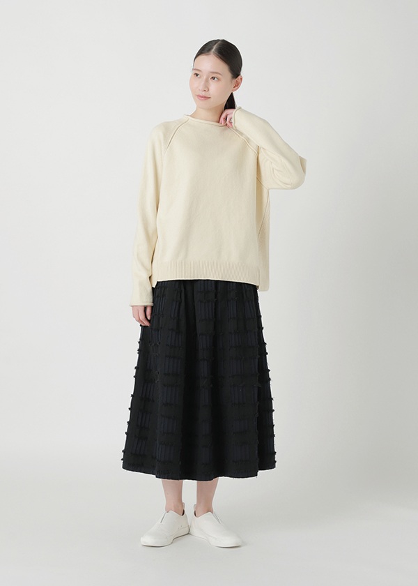 撚りをかけていない綿のスライバーからリリヤーンを作成し、綿本来のやわらかさと自然な光沢感を引き出しました。