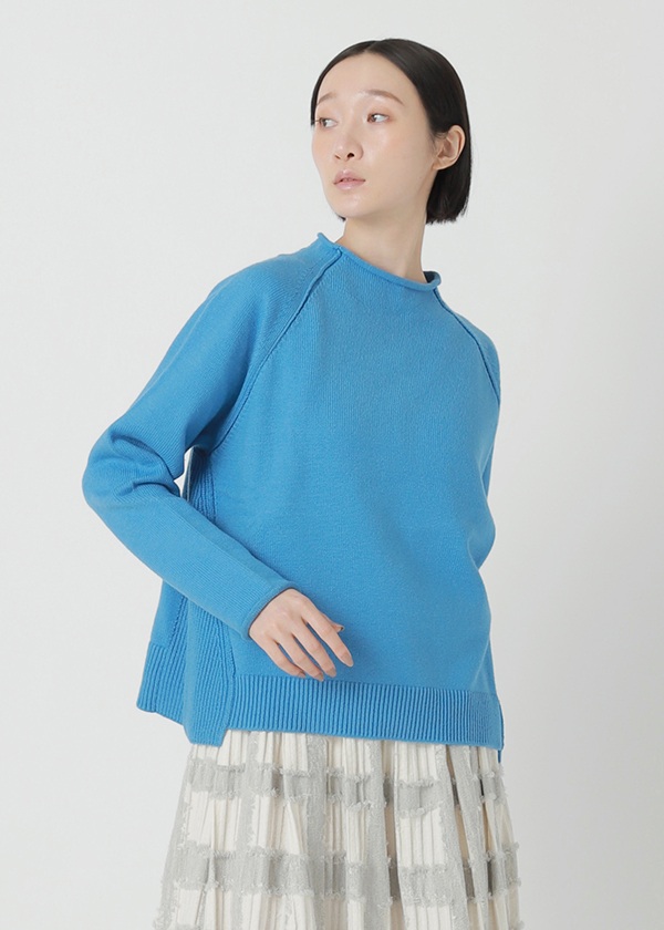 撚りをかけていない綿のスライバーからリリヤーンを作成し、綿本来のやわらかさと自然な光沢感を引き出しました。 ストレッチ糸を加えることで、伸縮性とバルキー性を持たせ、非常にやわらかく上質な風合いに仕上げています。