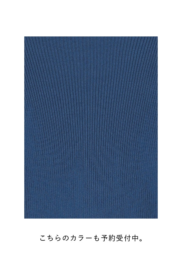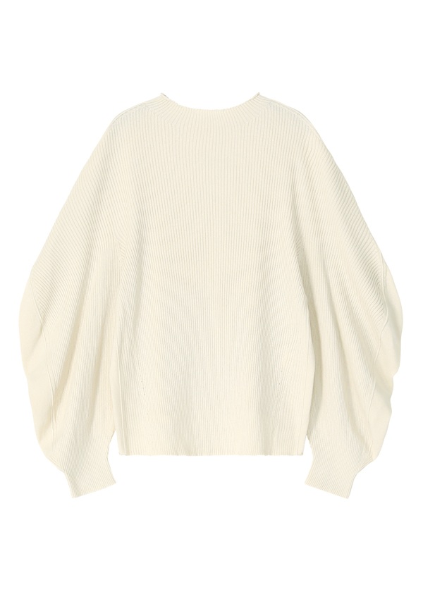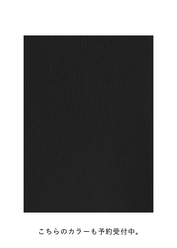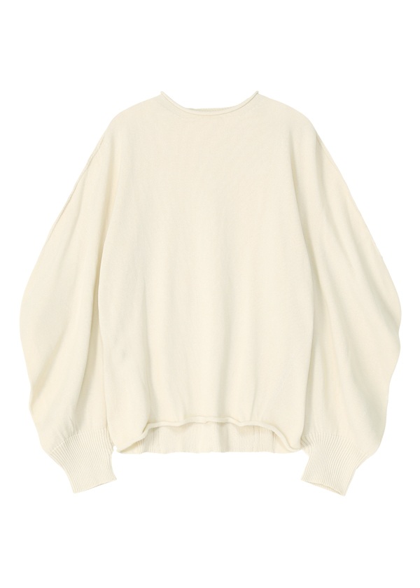 綿にストレッチ性のあるポリエステルを撚糸し、適度な伸縮性とハリ感を実現しました。シワになりにくく、着用時に立体感のあるシルエットが特徴です。ホールガーメントで前身頃と後身頃の編み組織を変え、表情にメリハリをつけています。