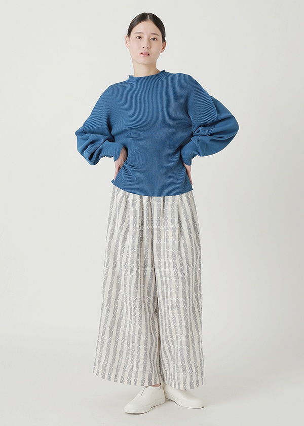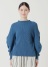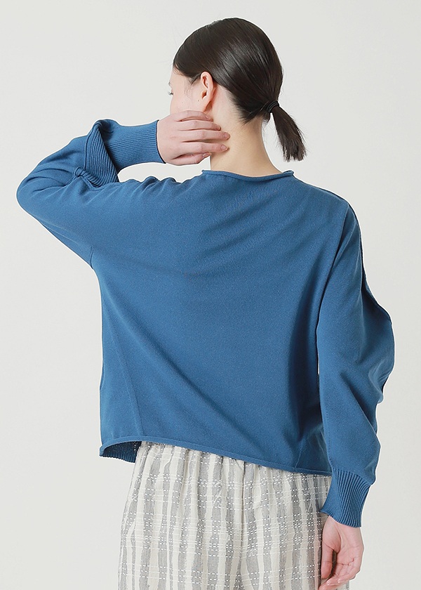 綿にストレッチ性のあるポリエステルを撚糸し、適度な伸縮性とハリ感を実現しました。シワになりにくく、着用時に立体感のあるシルエットが特徴です。ホールガーメントで前身頃と後身頃の編み組織を変え、表情にメリハリをつけています。
