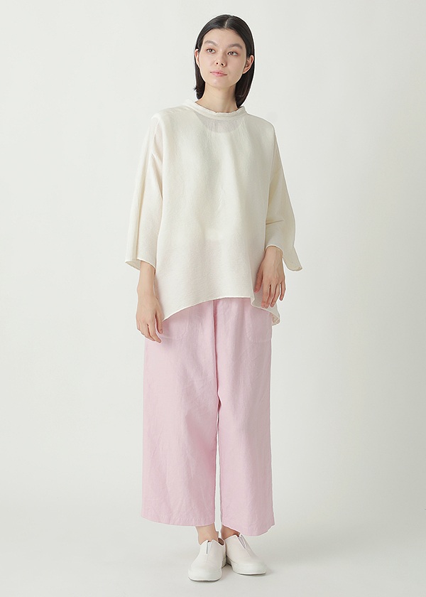 タテ糸にリネン糸、ヨコ糸にリネン糸とコットン糸を交互に切り替えて織り上げた、程よい表面感とナチュラルな風合いが特徴のキャンバス生地です。製品染めを施し、洗い晒しのような自然な仕上がりに。リネンコットンならではのドライでさらっとした肌触りが、清涼感のある着心地を生み出します。