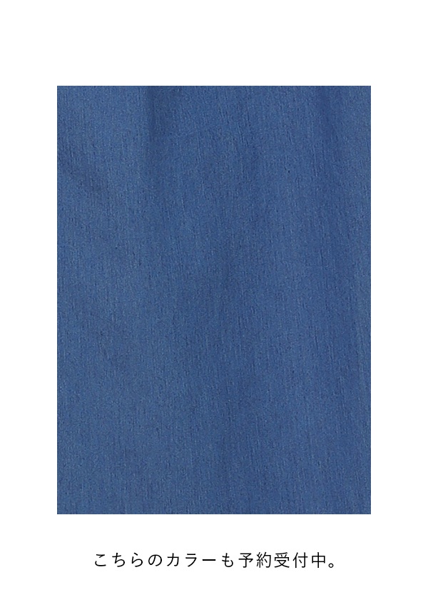 岡山地区のデニム織機でタテ糸に綿のムラ糸・ヨコ糸にコットンリネンの混紡糸を用いて織り上げた、自然なムラ感と奥行きのある色合いが特長のライトなデニムです。ライトブルーはタテ糸に硫化染料で染めた淡いブルー。ネイビーは、インディゴに染めた上から硫化ブラックでオーバーダイした深いネイビーをそれぞれ用い、ヨコ糸にはニュアンスのあるグレーの糸を打ち込みました。