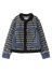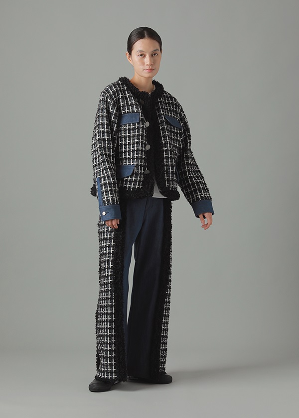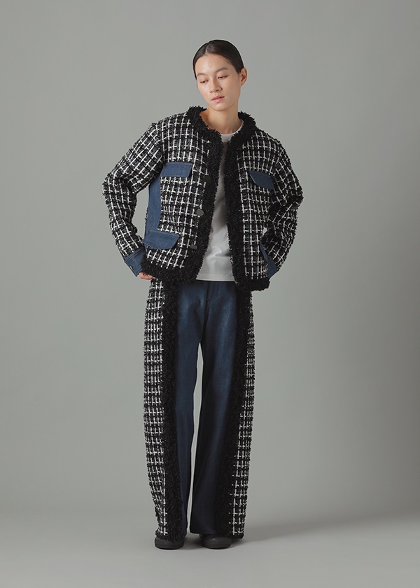 -デニムとファンシーツイード風ニットをドッキングしたノーカラージャケット。