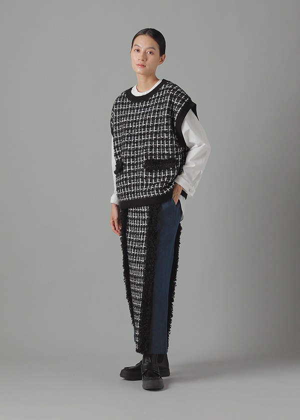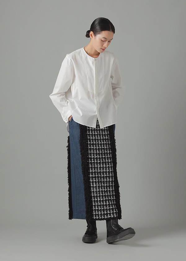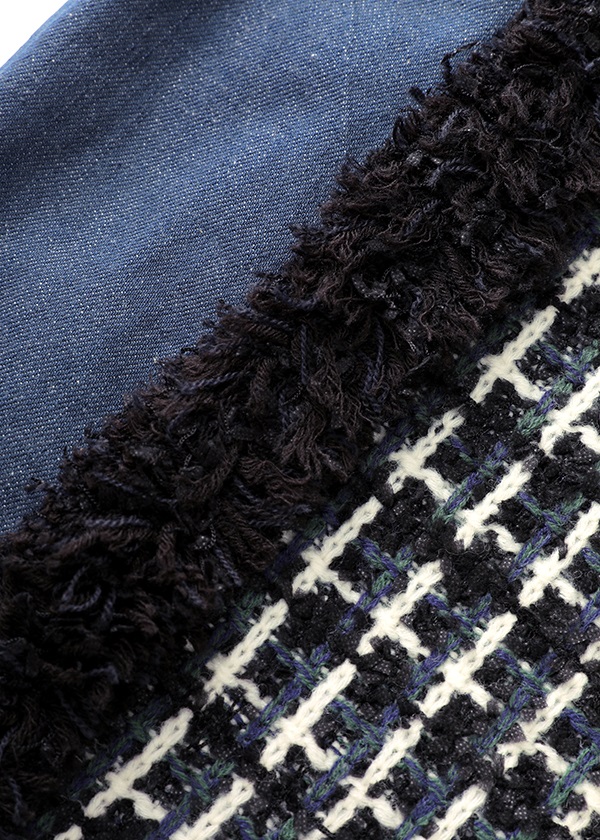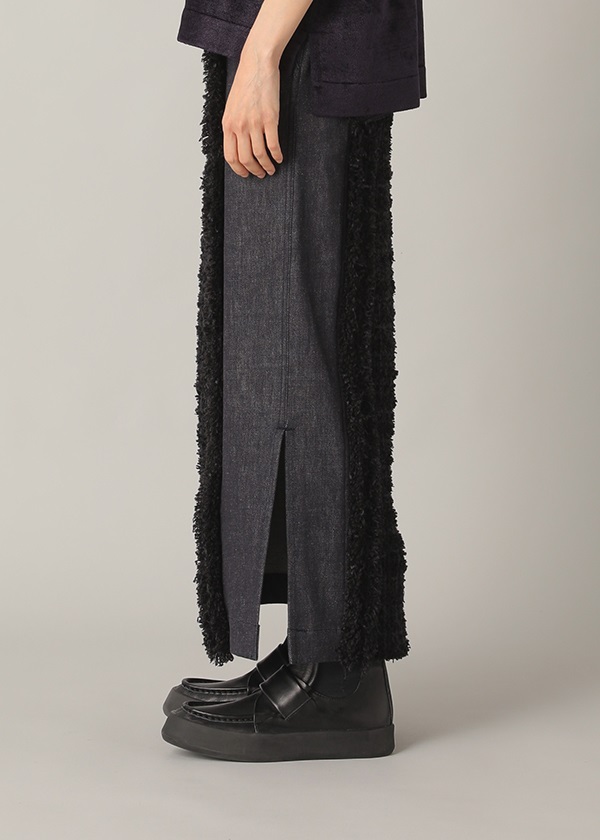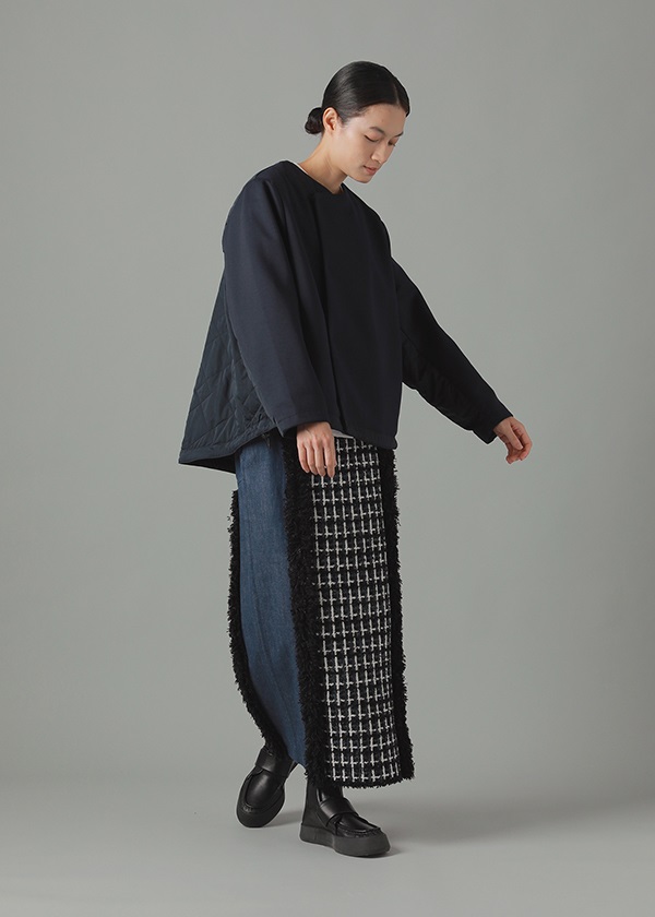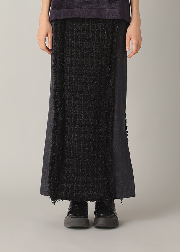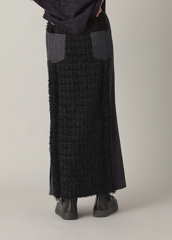 -デニムとファンシーツィード風ニットをドッキングしたナロースカート。