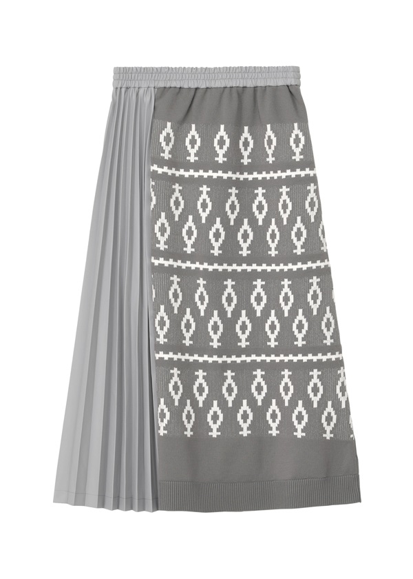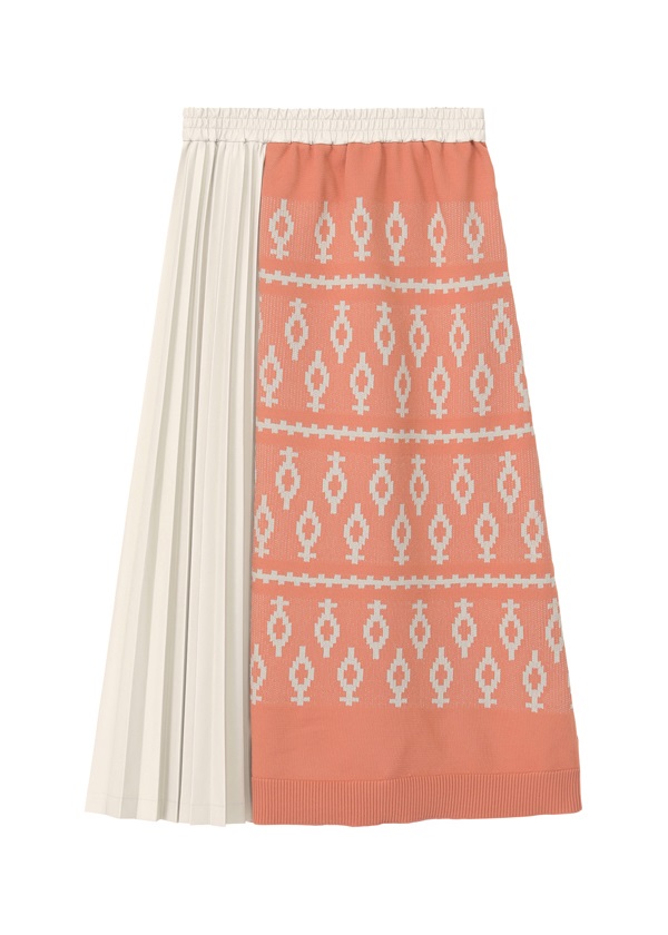-エスニック調のジャガードニットと光沢あるフェイクレザーをドッキングしたスカート。