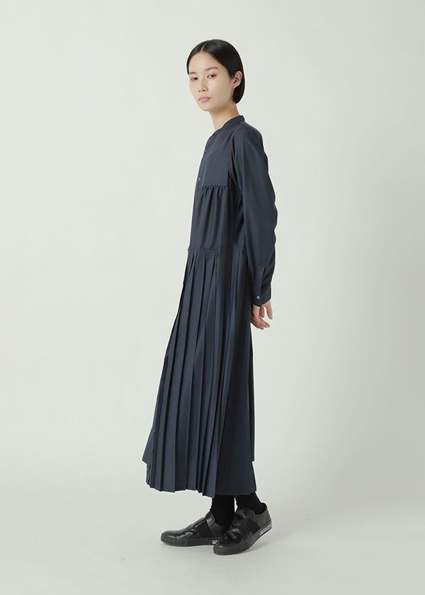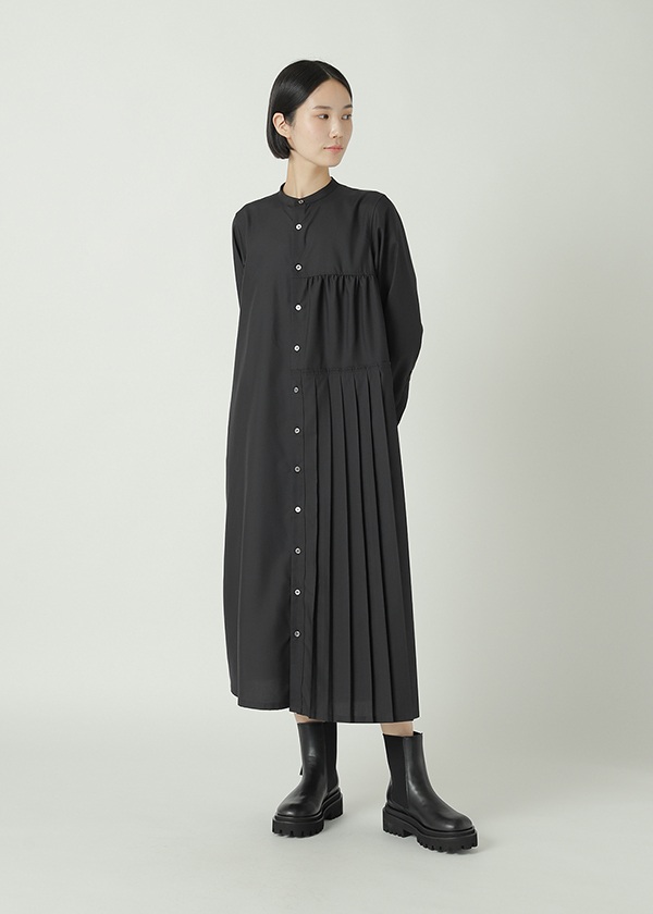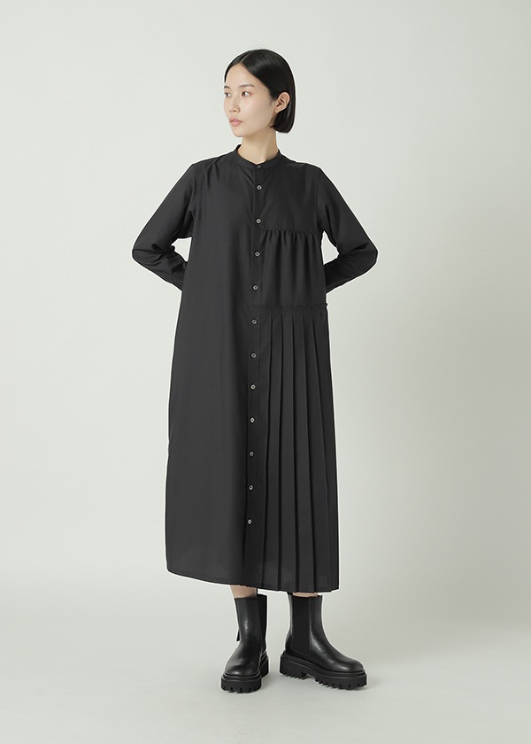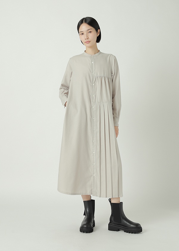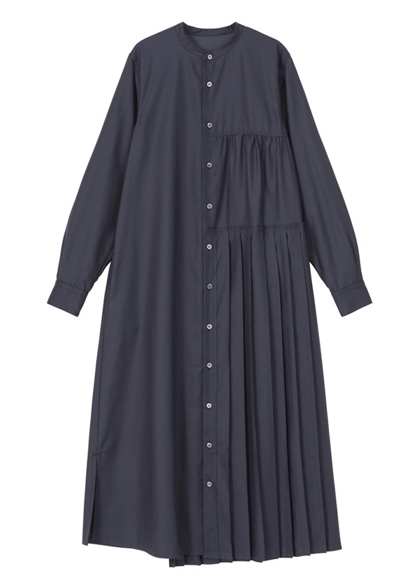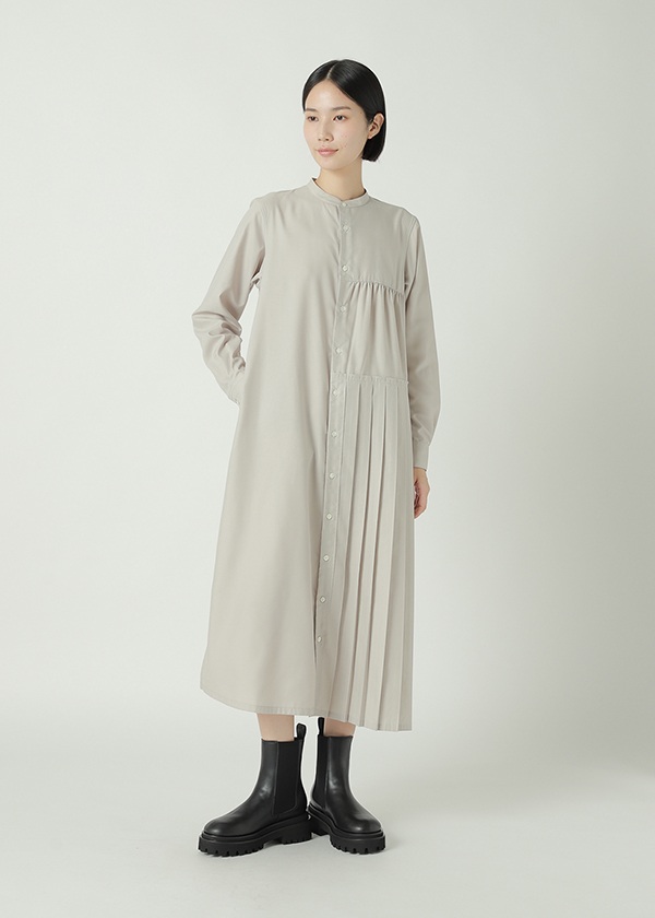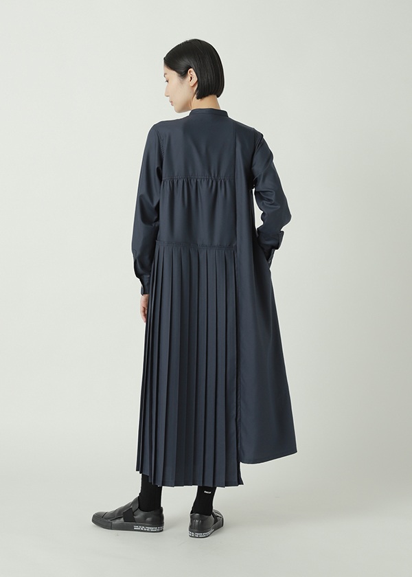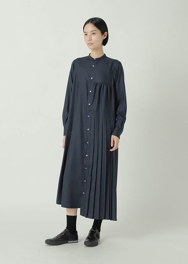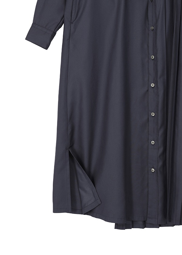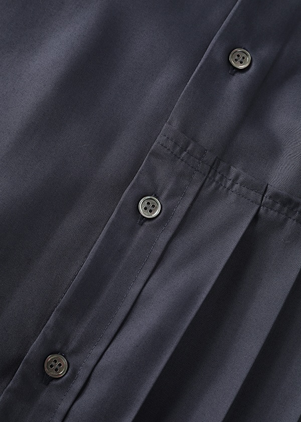 -片側にプリーツを配したアシンメトリーデザインのシャツワンピース。
