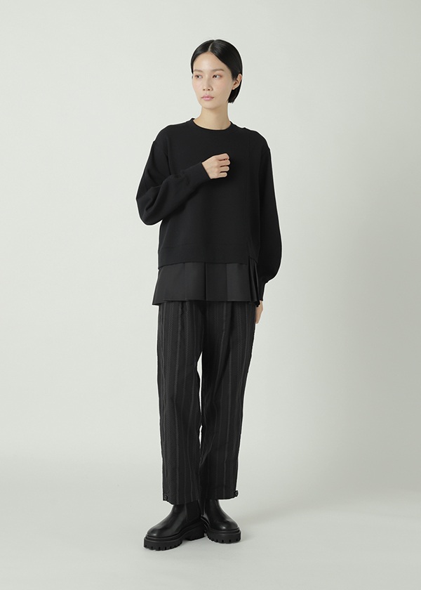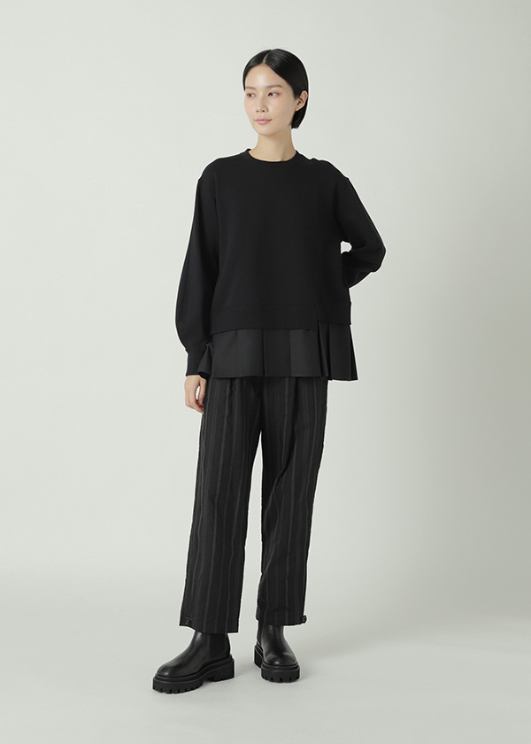 こちらの商品は、熱と圧力によるプリーツ加工を施しています。着用や洗濯を繰り返す事により、プリーツが徐々に消失していきます。予めご了承下さいませ。また、着用、保管の際は、長時間圧力がかからないようにして下さい。