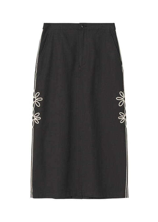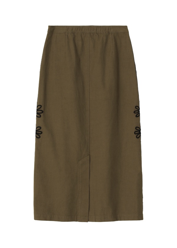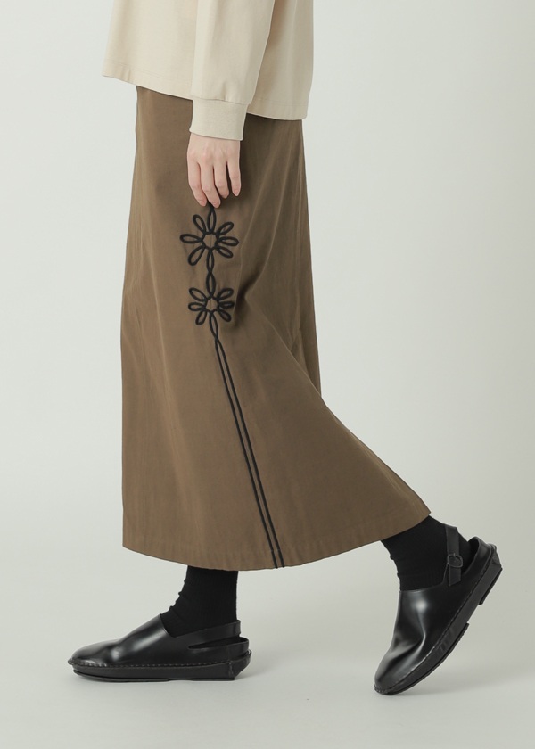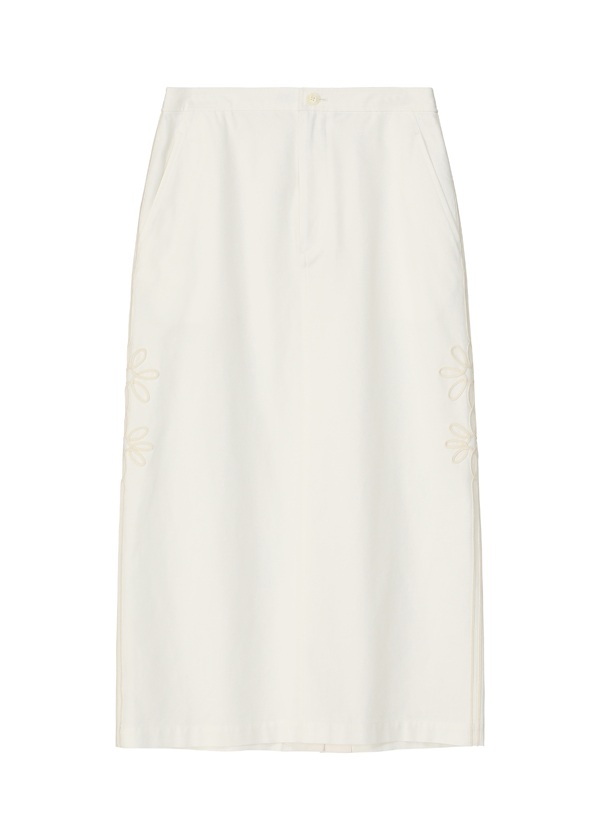 -サイドシーム上に、8枚花びらのコード刺繍モチーフを2輪配置