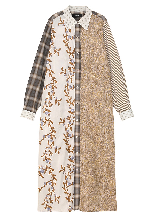 -ペイズリーや植物柄、チェックなどの異なるパターンを左右非対称に大胆に配置