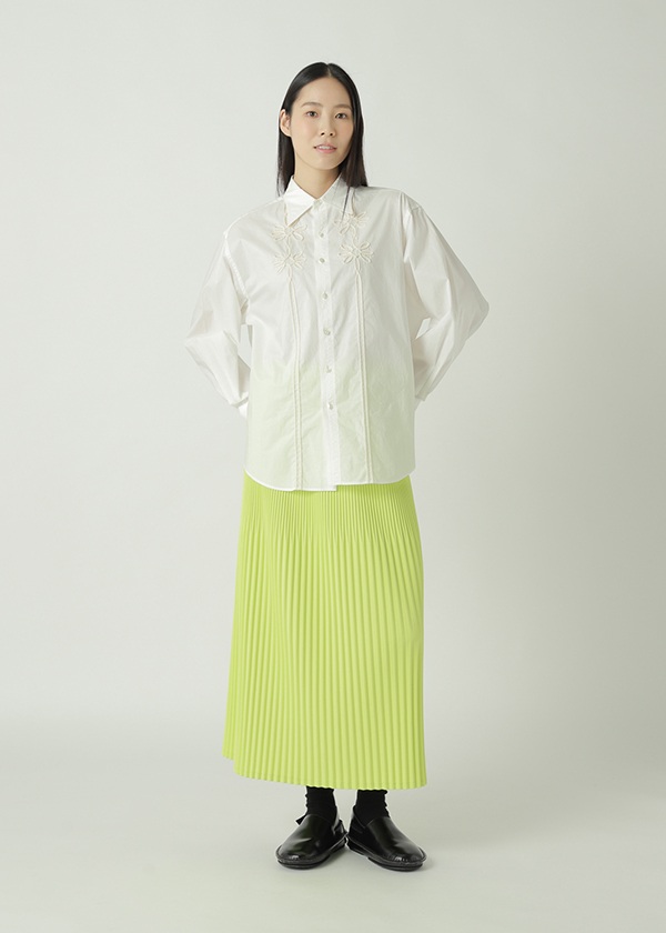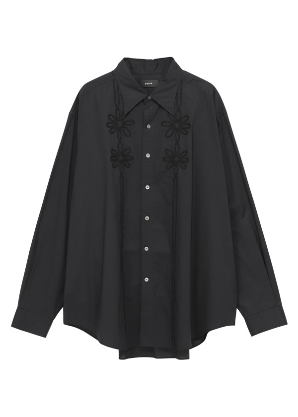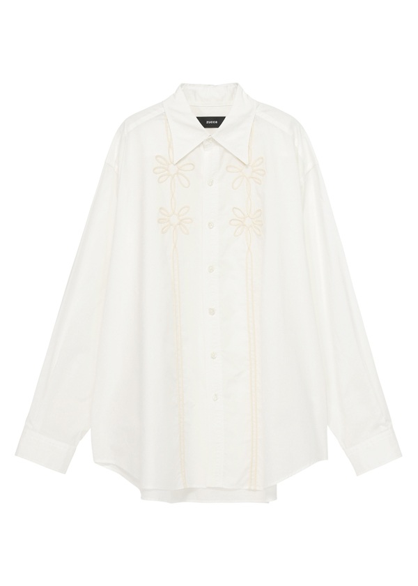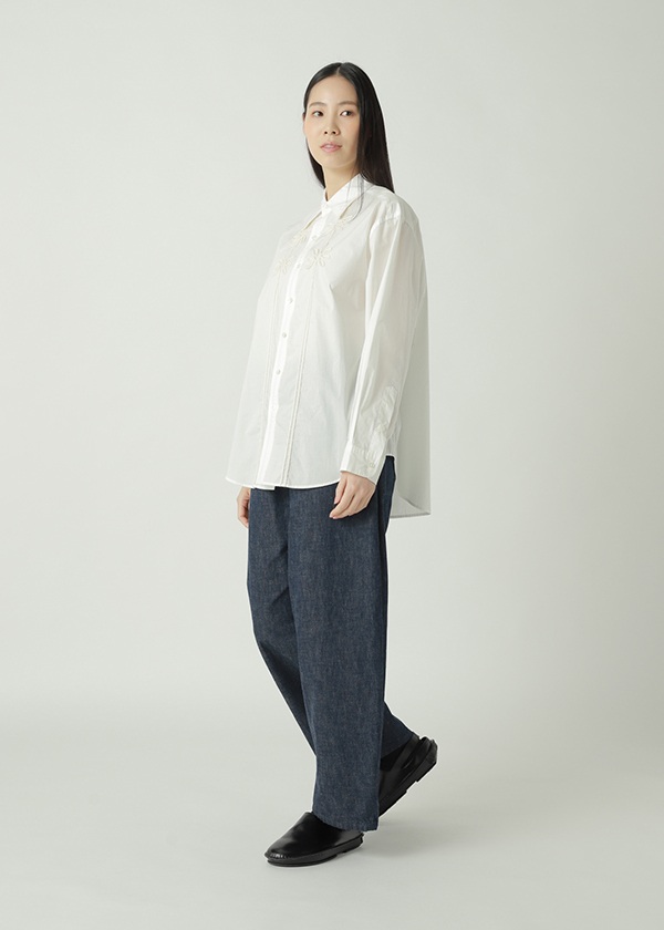 -直線的なシャツに柔らかさを添える、胸元の8枚花びら(ユイットペタル)の立体コード刺繍