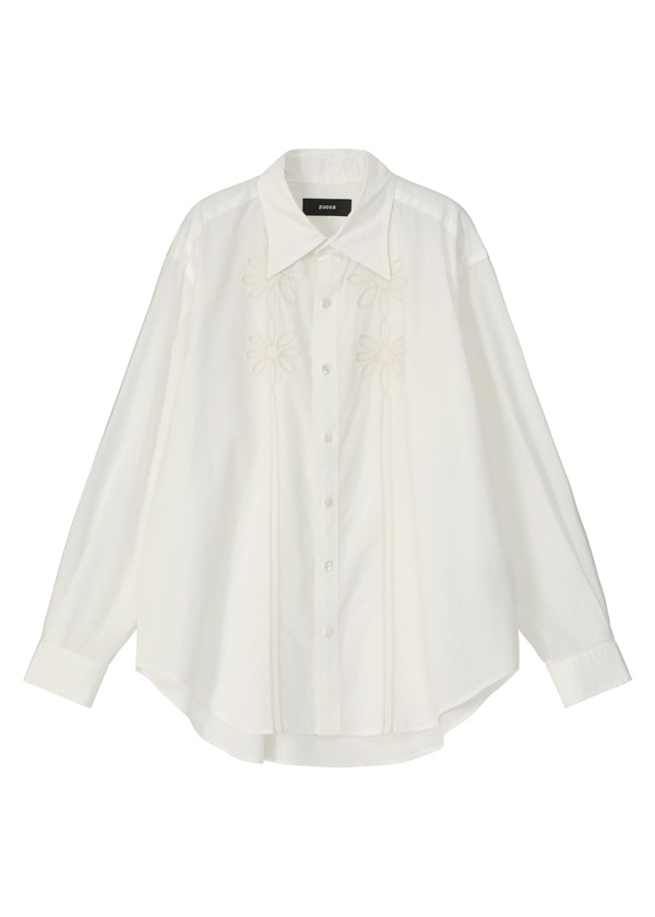 -直線的なシャツに柔らかさを添える、胸元の8枚花びら(ユイットペタル)の立体コード刺繍
