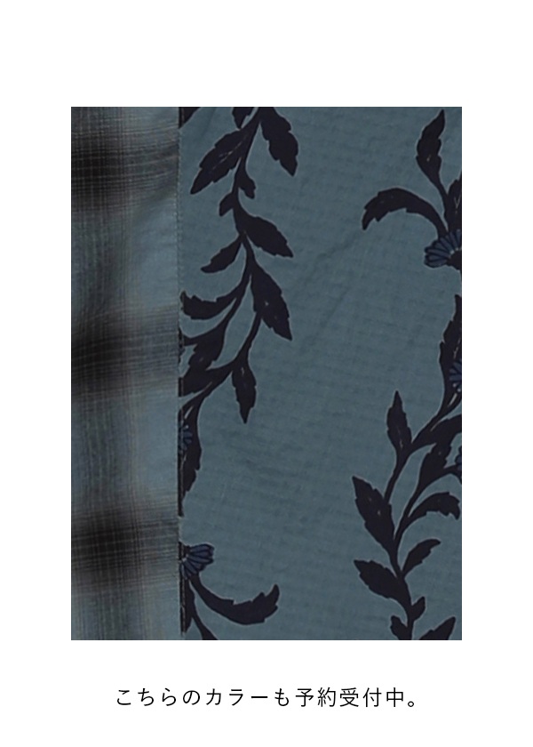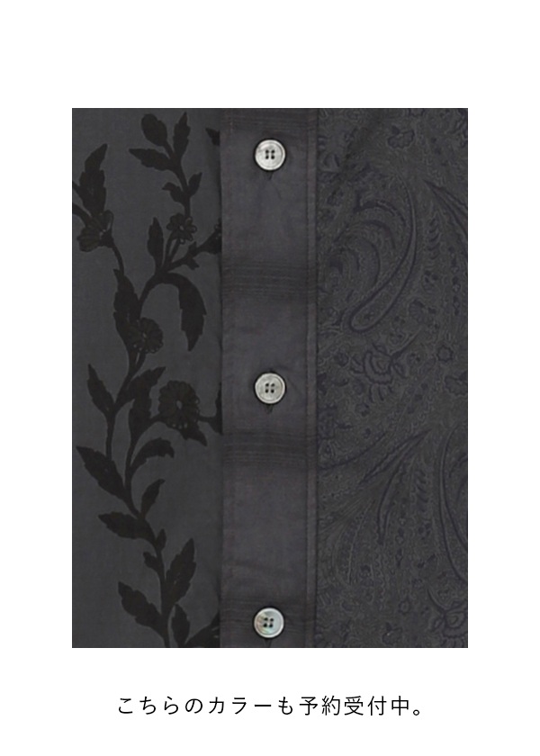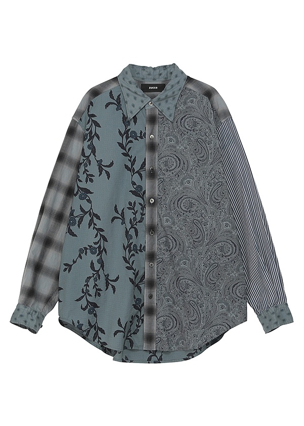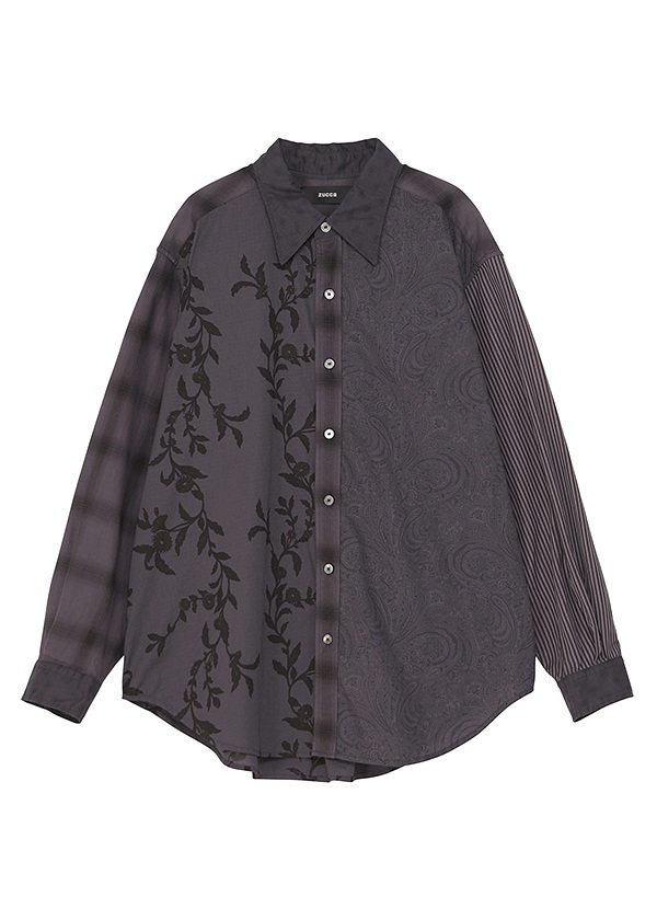 -デイジーモチーフの花柄を中心に、ペイズリー・小紋・チェック・ストライプの5柄をパーツごとに切り替えたアートピースのようなシャツ