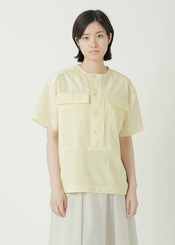 -フラップポケットや切り替えポケットを配した構築的デザインのブラウス